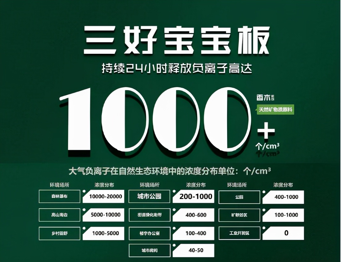 包含负离子的三好宝宝板,具有净化空气、烟雾及甲醛的效果,让家长期保持在公园相当的负离子空气环境中。